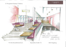 Entwurf für Gestaltung des Eingangsbereichs mit Empfang, Caféteria und angrenzende Behandlungsräume